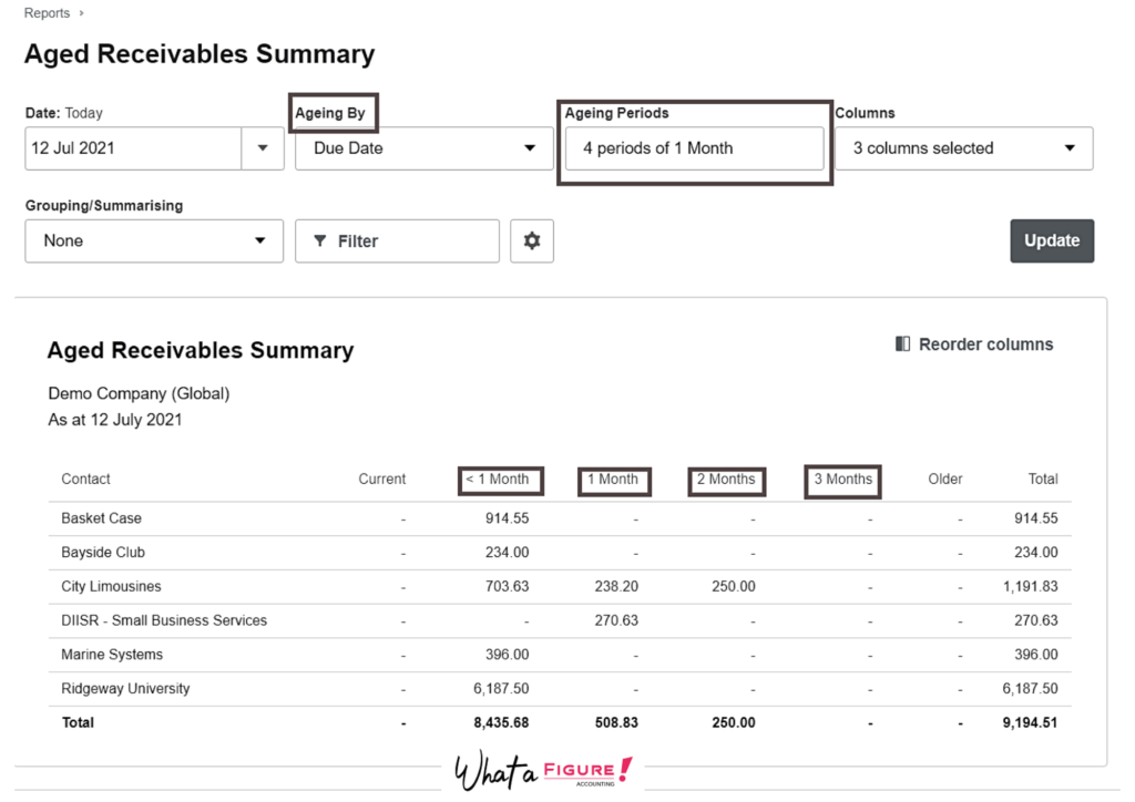 This kind of report gives more space for customizing it depending on your preferences and needs. You can choose the aging period, invoice details you want to include in the report (invoice number, contact details, tax amount, etc) or even group it by tracking categories.
