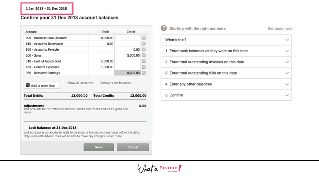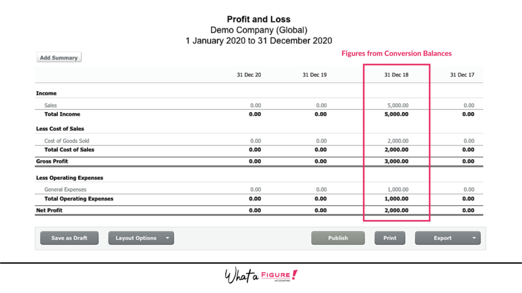 So, if your last year end was 31st Dec 2019, then you will have all the Balance Sheet figures for 31st December. Balance Sheet includes your profit for the year (1st Jan – 31st Dec). So instead of entering this total figure, you can enter the full Profit & Loss for the year: 1st Jan – 31st Dec. What this means is that you will also have 1 year of Profit & Loss report in Xero for historical results. Please note, you can only enter 1 year’s Profit & Loss in Xero conversion balances like this.